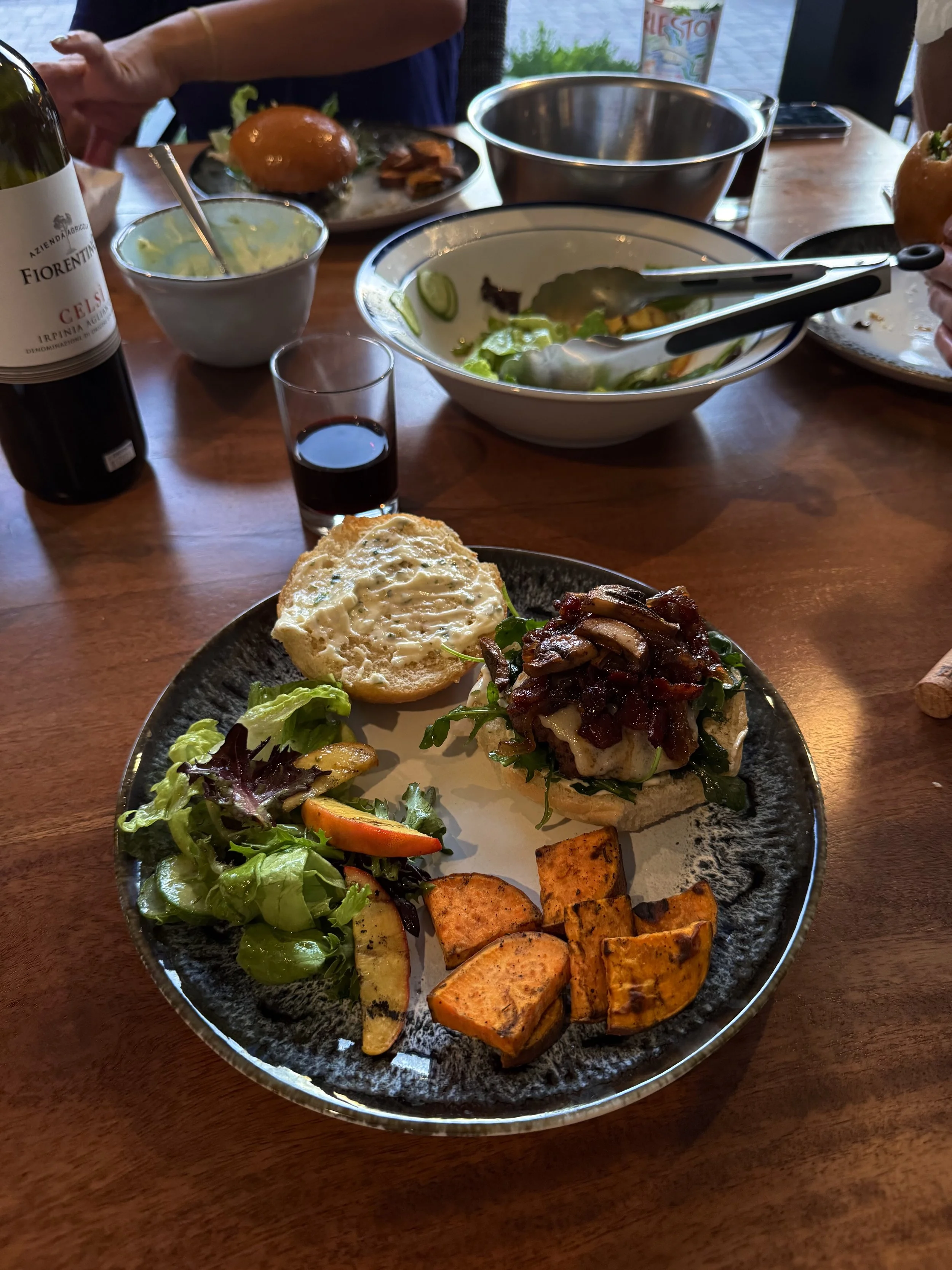 Assembly time. Put some aioli on the top and bottom of the bun. Make a bed of arugula. Put 1-2 smash patties on the bun. Add your bacon jam and sauteed mushrooms and you are ready to devour.
