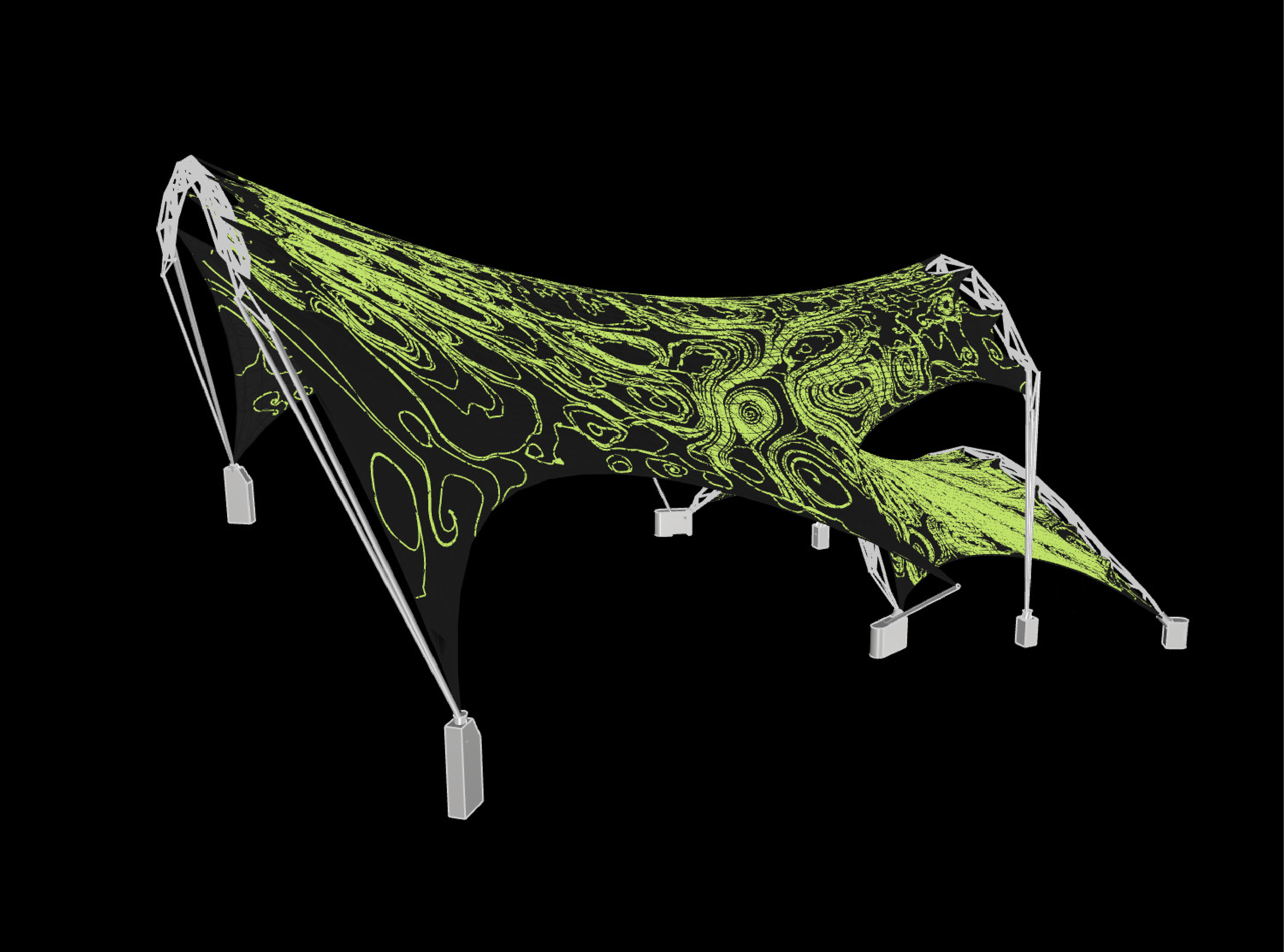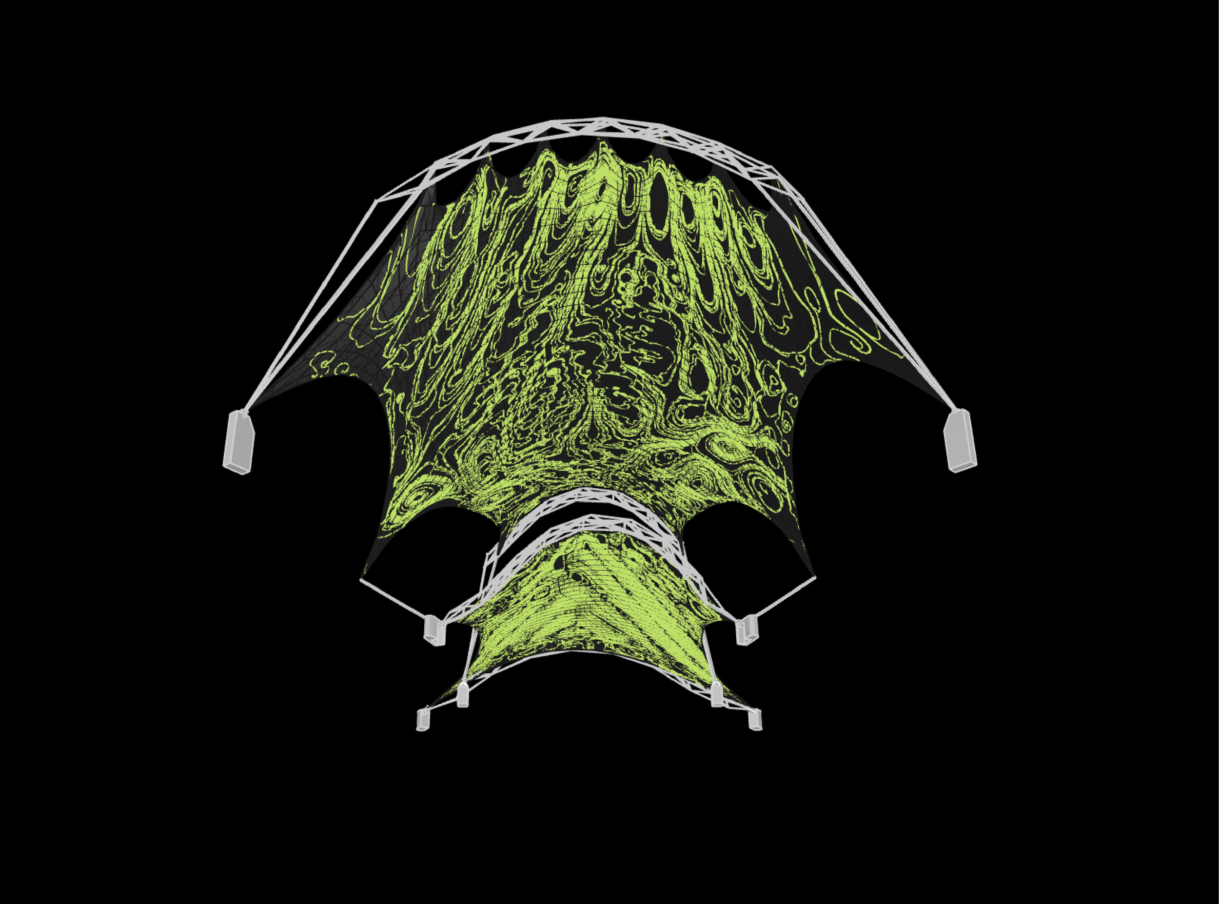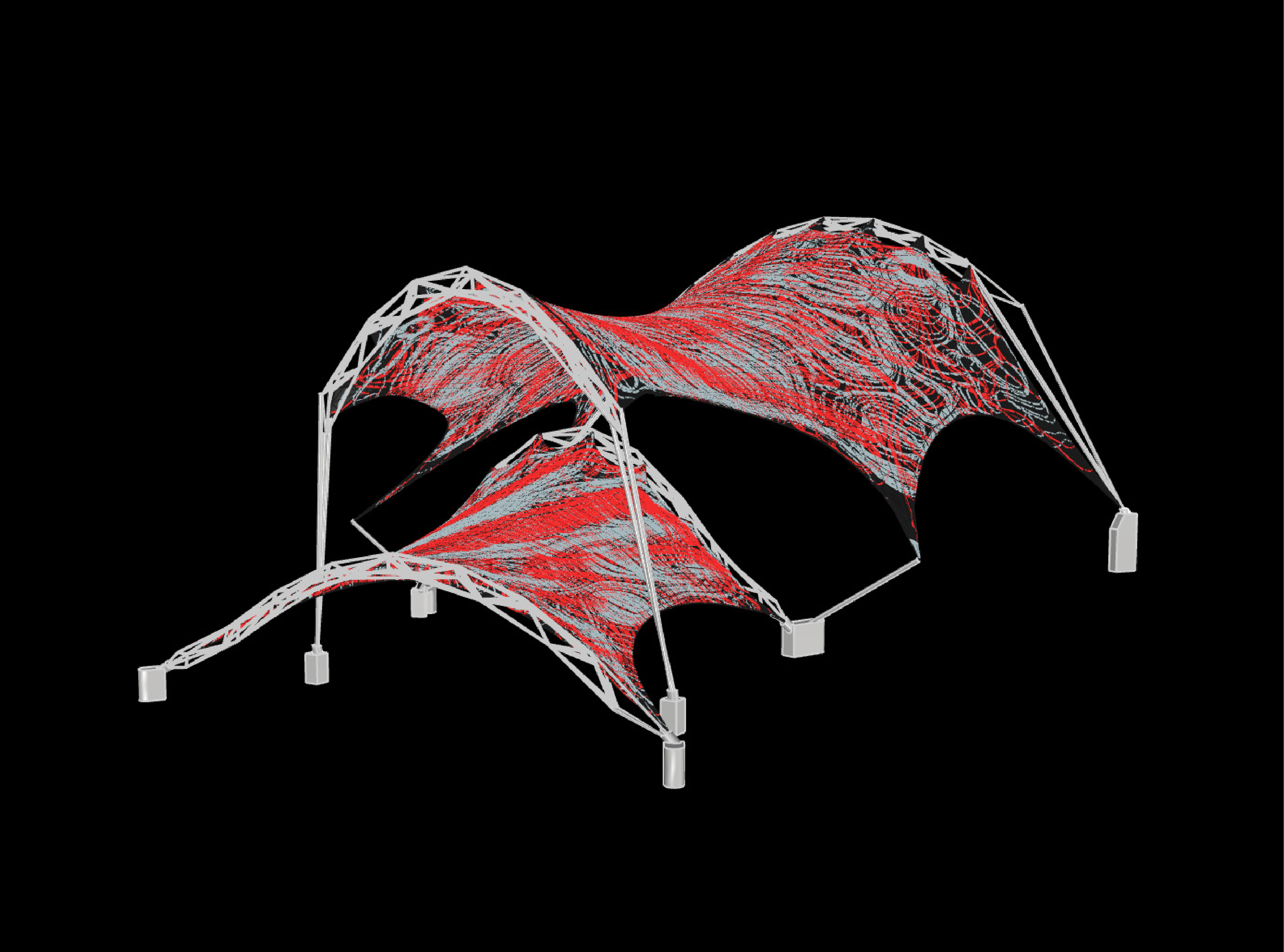 This project explores the development of a tensile structural system for a proposed amphitheater at Knoxville’s World’s Fair Park using Grasshopper as a generative design and analysis tool. Drawing inspiration from precedents such as the Sun Station in Santiago de Chile and the CU Valles project, the design investigates space truss systems anchored to concrete structural bases and secondary structural elements that provide additional support to the tensile form. Through parametric scripting, the project examines structural archetypes, structure to skin relationships, energy considerations, and material properties.